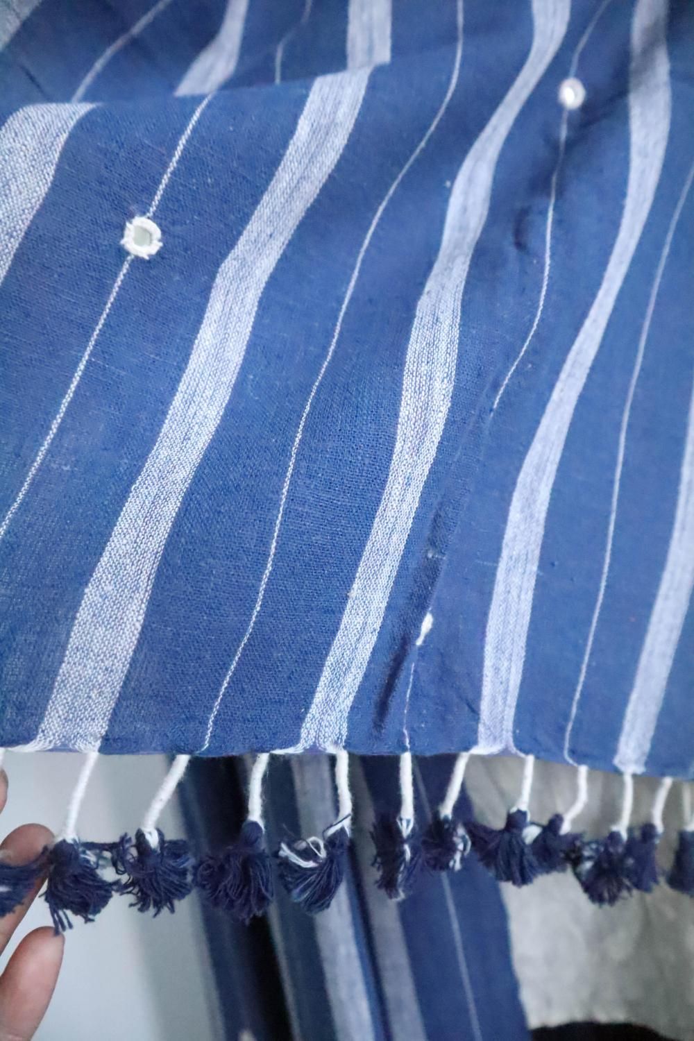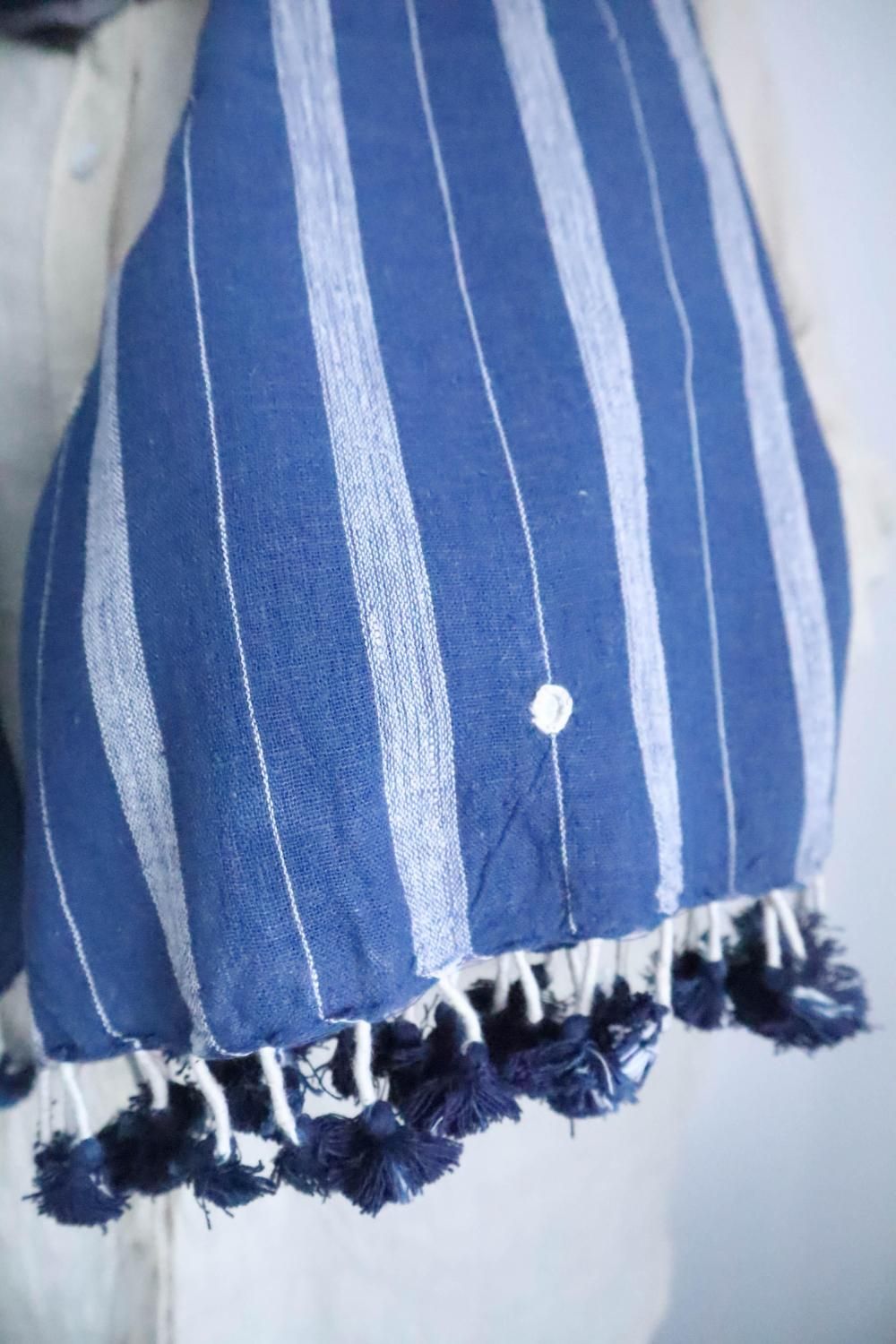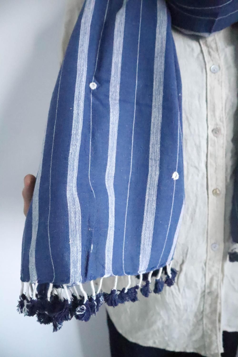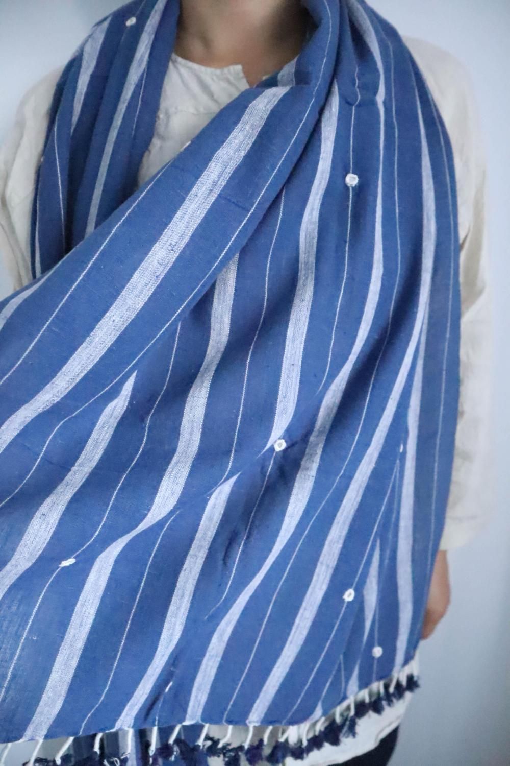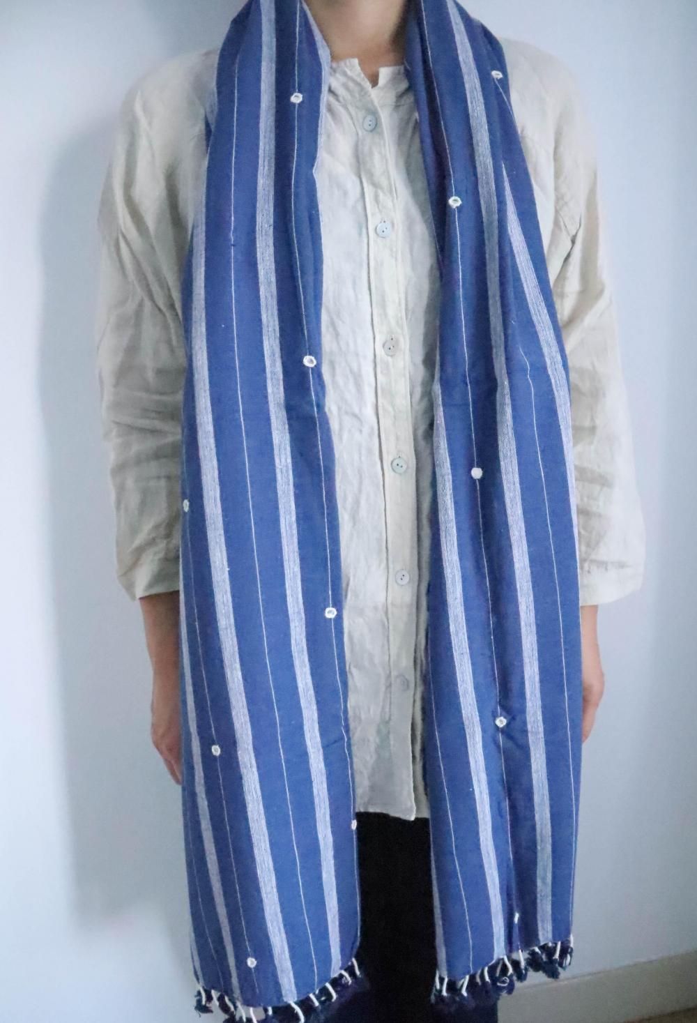 カラコットンストール ブルー地に白ボーダー&ミラー刺繍