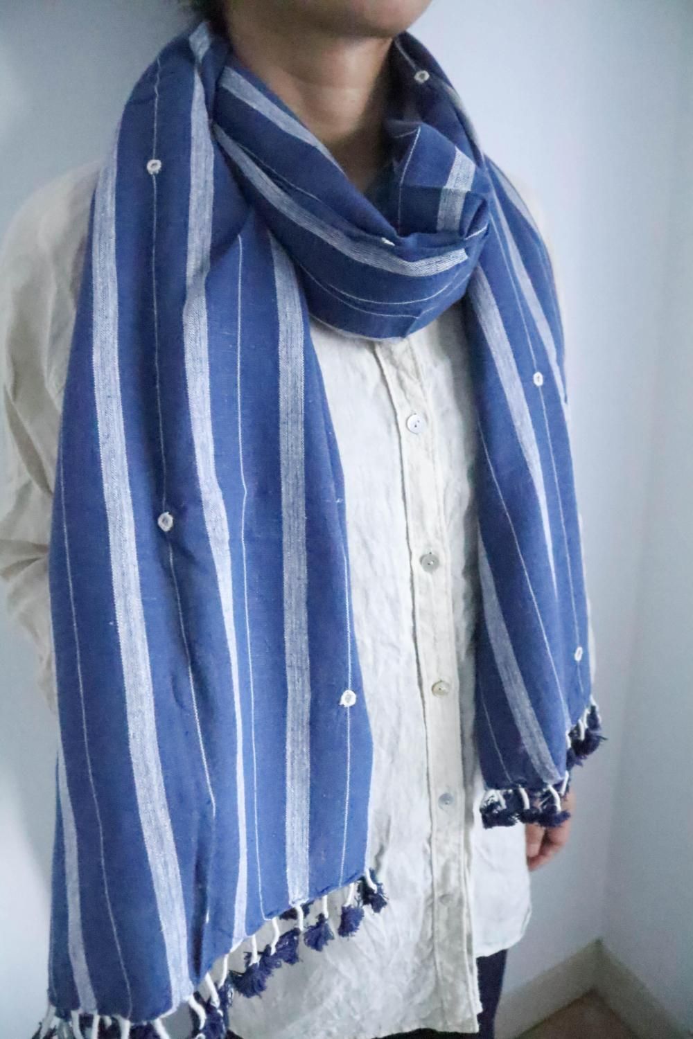 カラコットンストール 生成りにブルーボーダー&ミラー刺繍