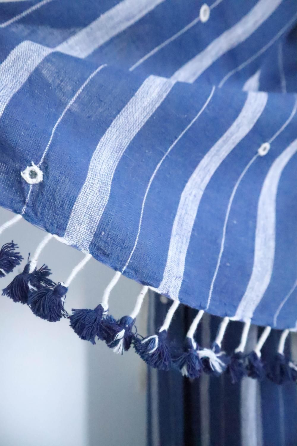 カッチ地方の手織りコットンストール。柔らかなファインコットンが心地よく、薄手で持ち運びもラク。カラフルなフリンジがアクセント。使いやすさと華やかさを兼ね備えた万能アイテム。