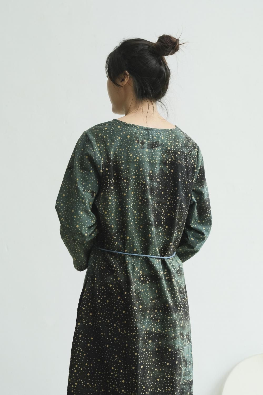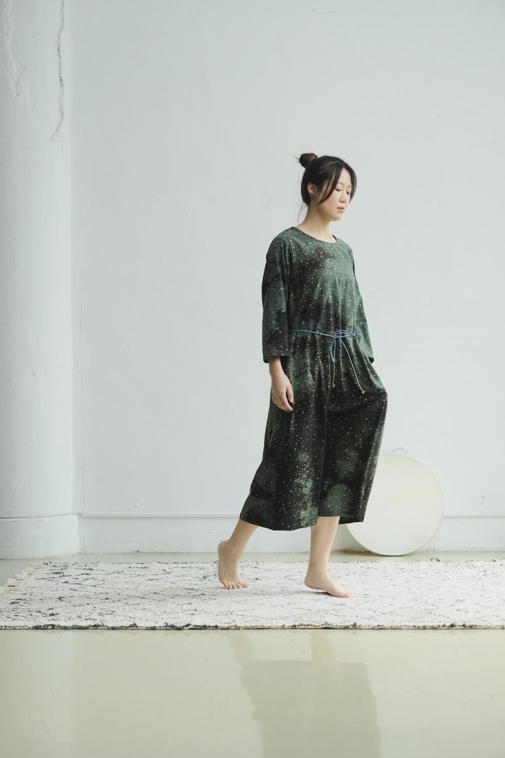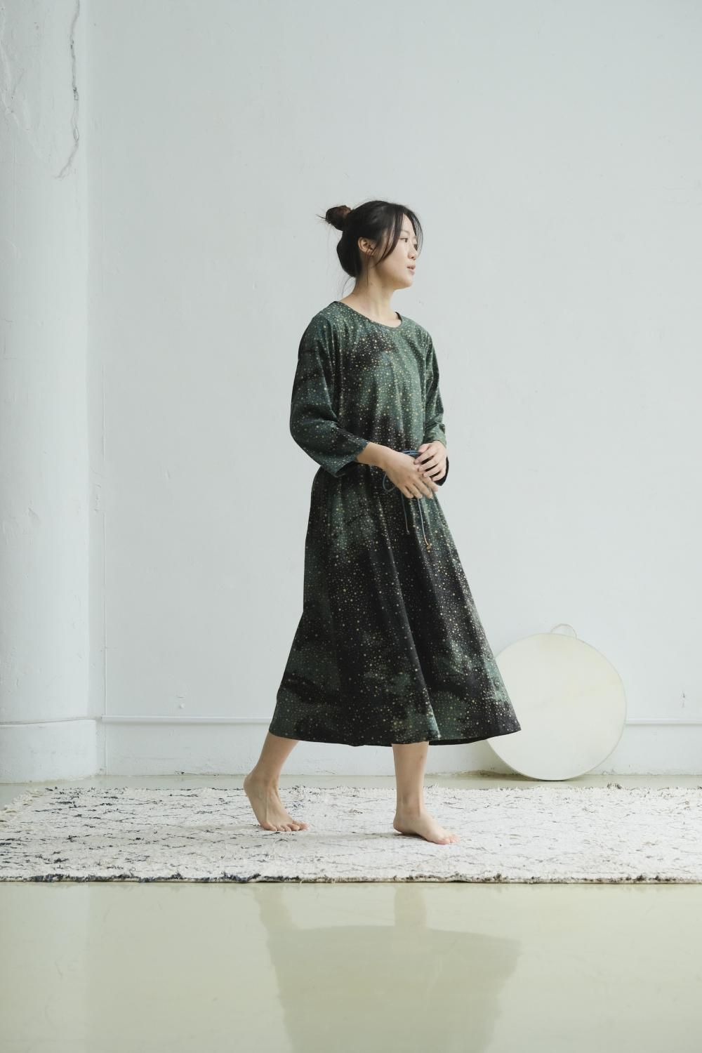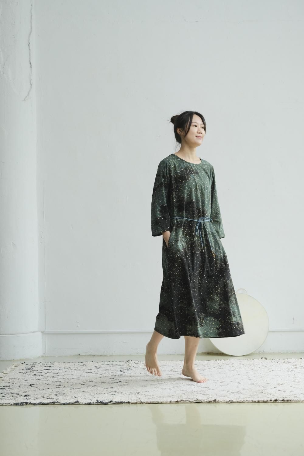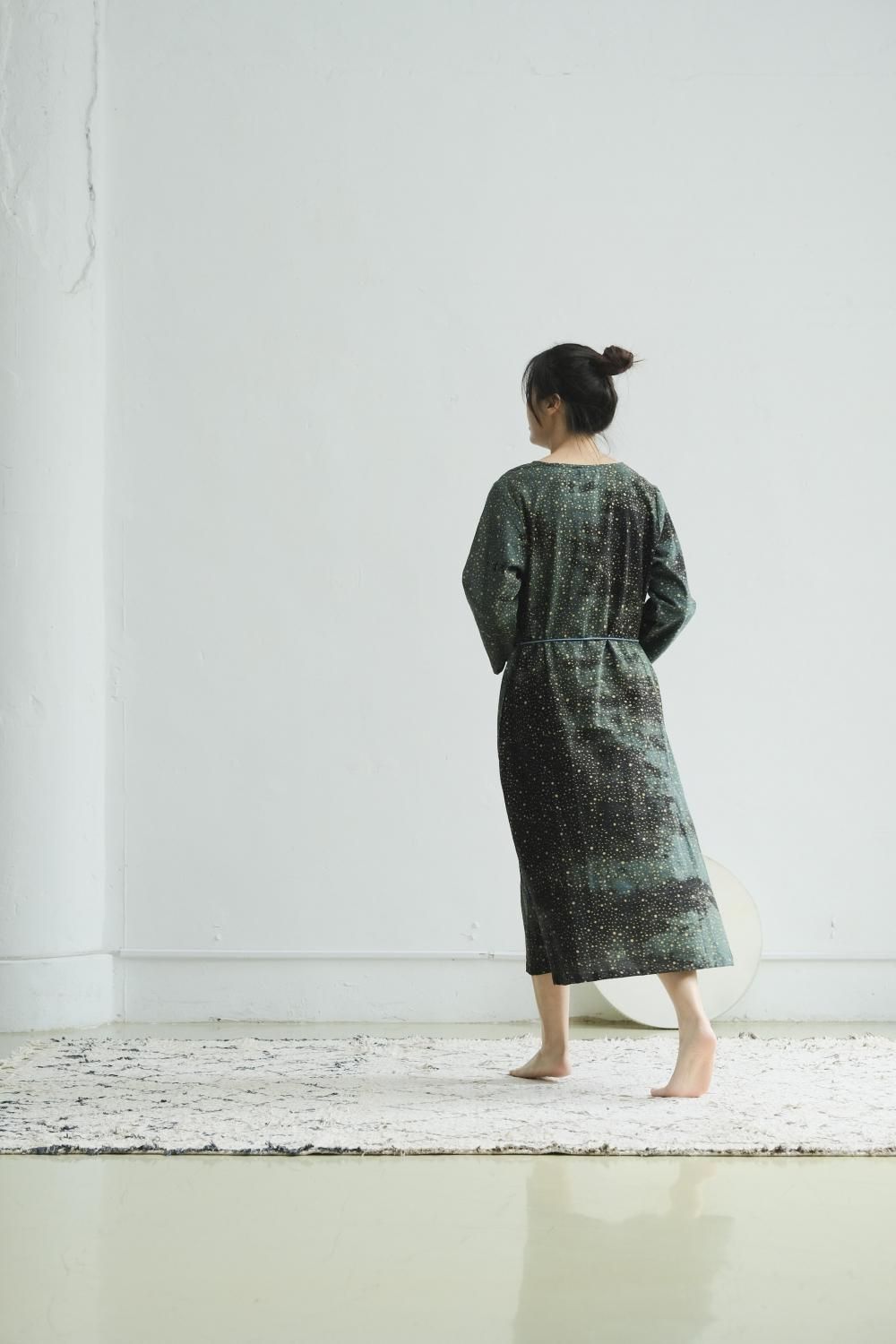 シャツワンピース B050 stardust green。ゆったりシルエット、コーデ自在。手染めダブプリント、コットン100%。身長169cmモデル着用。