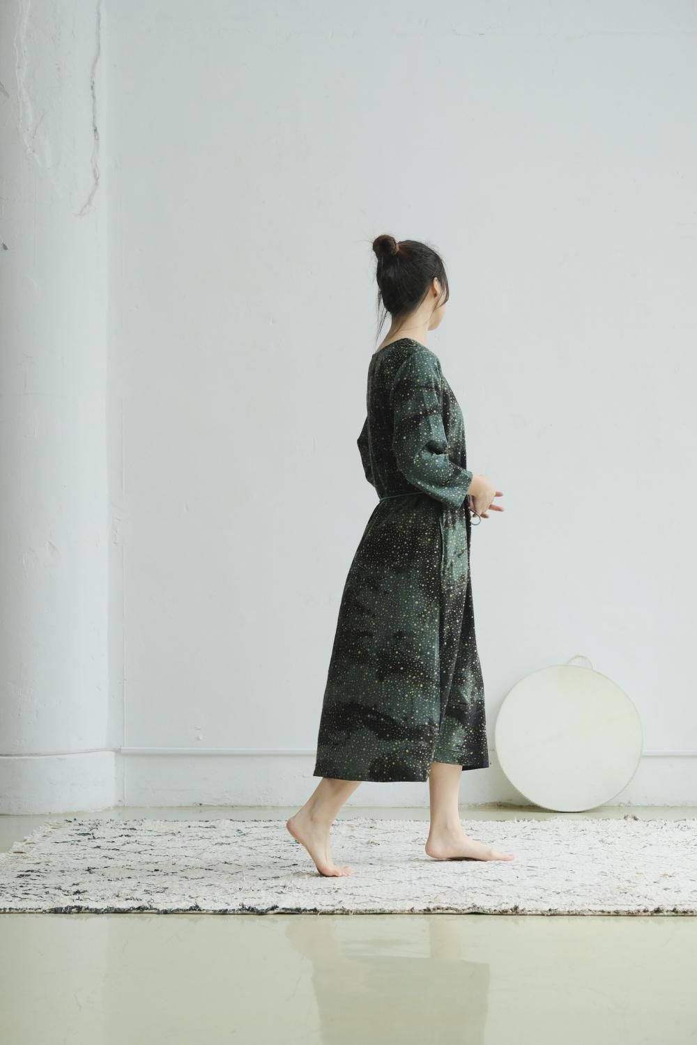 アートな泥防染プリントが魅力的な、機械生地のフロントクロスワンピース。インド製の上質コットン100%、肩幅50cm、身幅52cm、着丈119cm、袖長29cm、裄丈55cm。心地良い着心地で、月花草-seed-にインスピレーションを受けたデザイン。