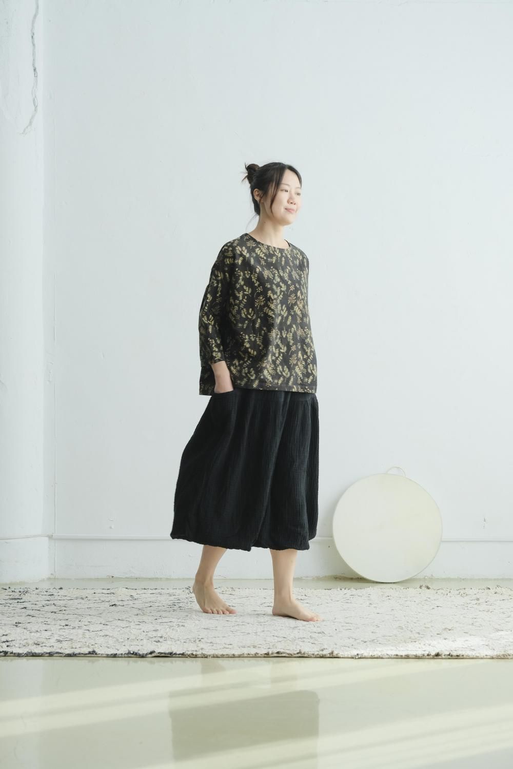 風のような軽さを感じる、モスリンカディ生地を使ったゆったりとしたトップス。手染めの独特なカラーで色移りに注意。