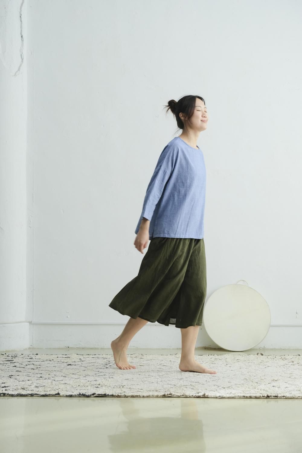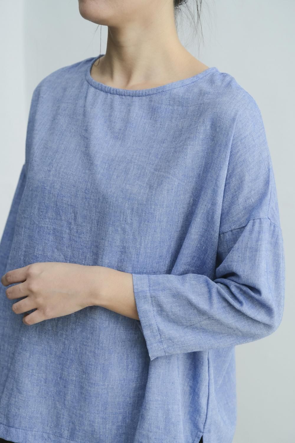 khadiの軽量カディ生地を使用。ラウンドネック&ショルダーオフのデザインが魅力的。肌触り◎お尻も隠せる7部丈袖。手作り品の風合いは一点物の魅力。