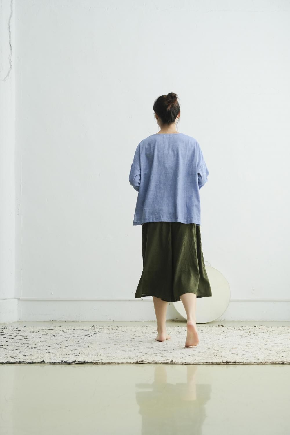 風のような軽さを感じる、モスリンカディ生地を使ったゆったりとしたトップス。手染めの独特なカラーで色移りに注意。