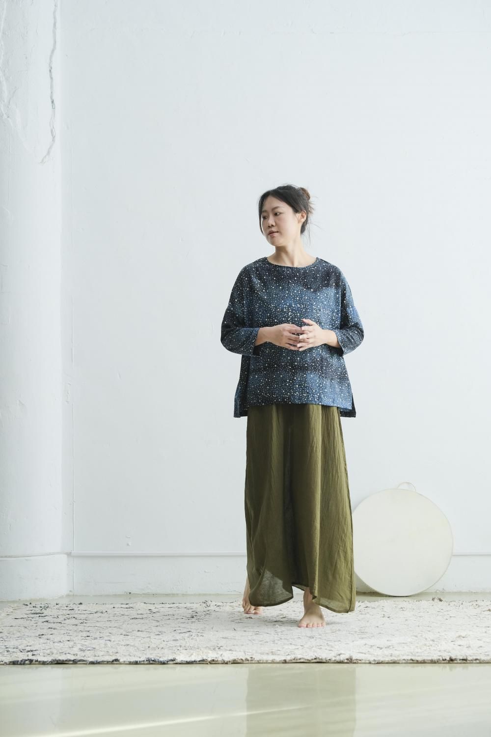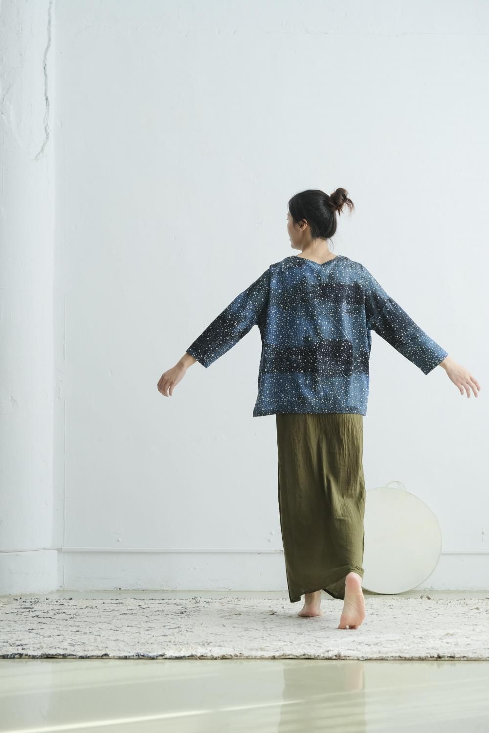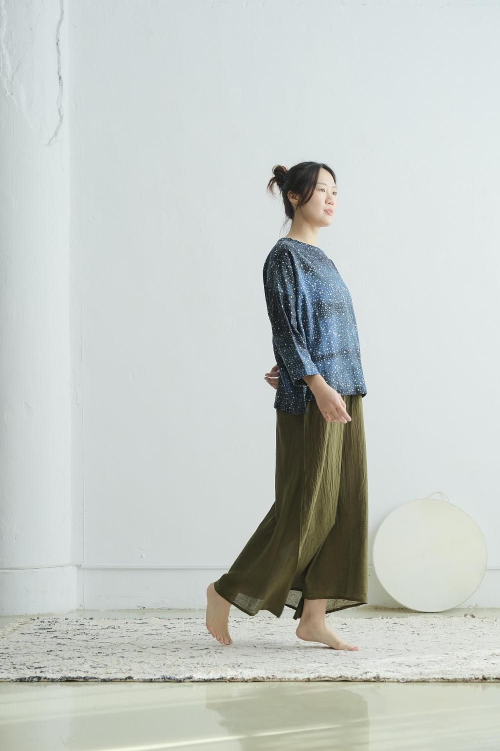 風のような軽さを感じる、モスリンカディ生地を使ったゆったりとしたトップス。手染めの独特なカラーで色移りに注意。