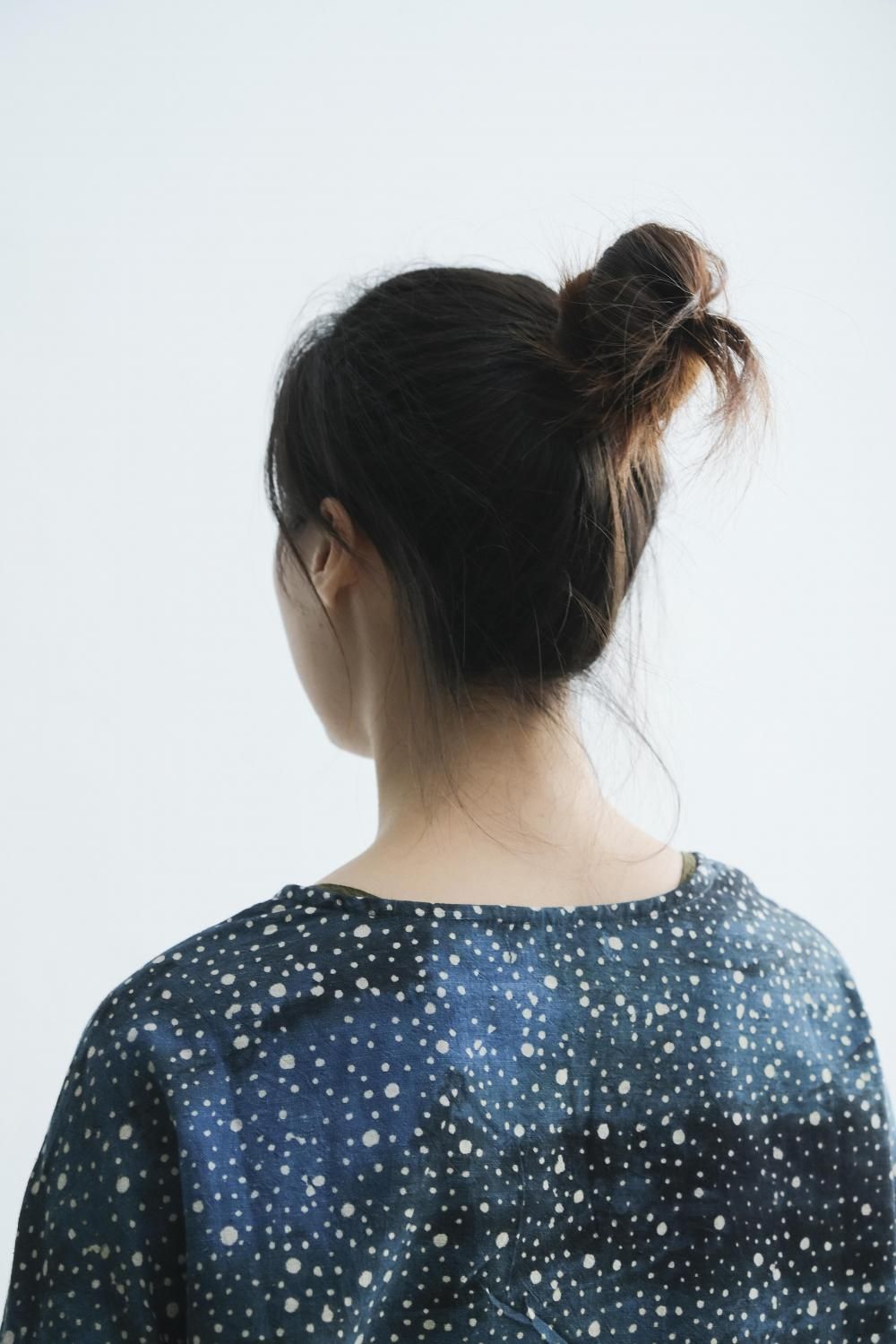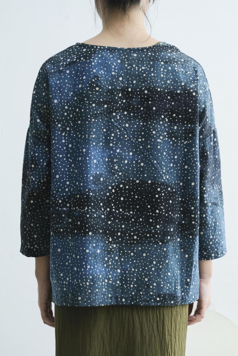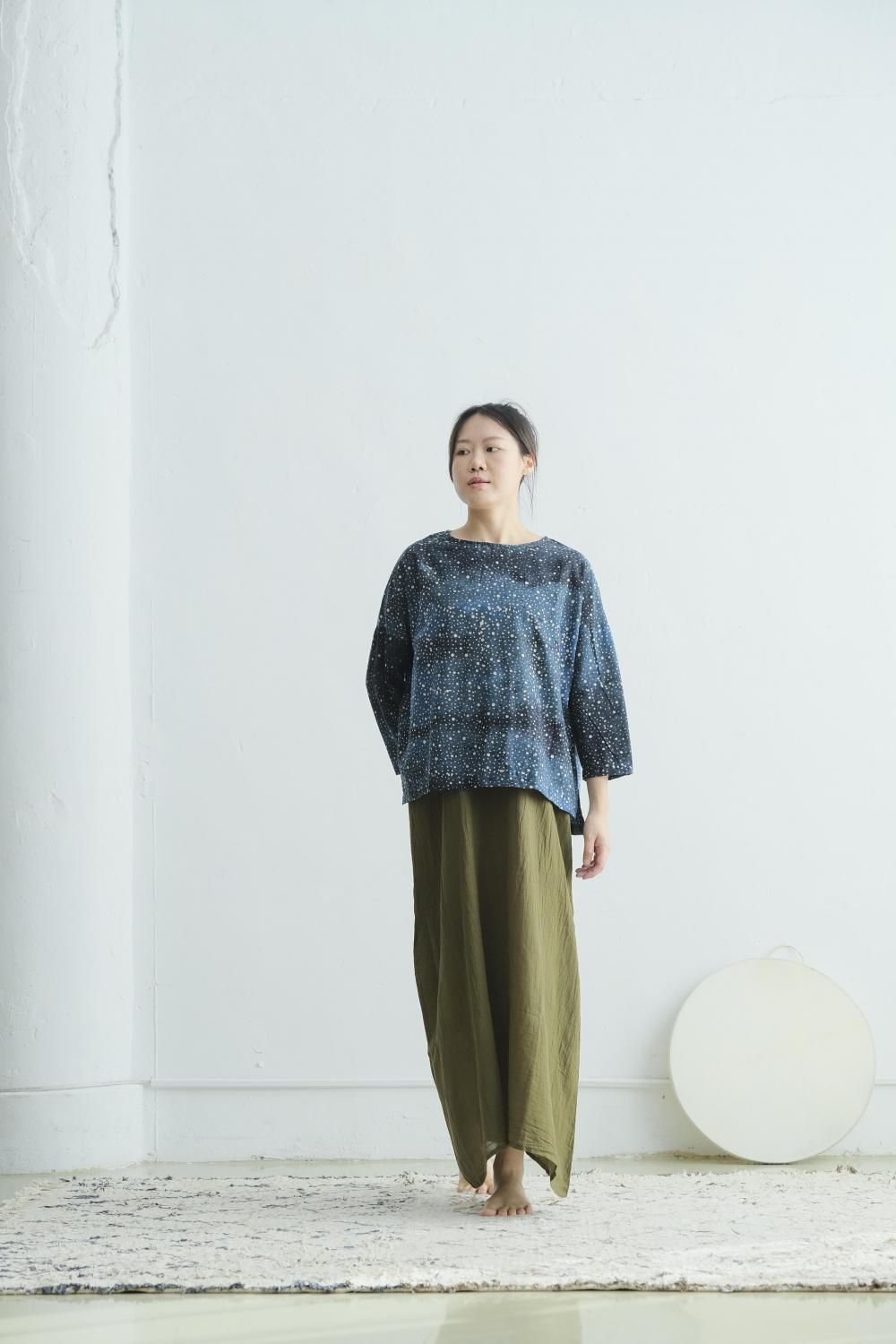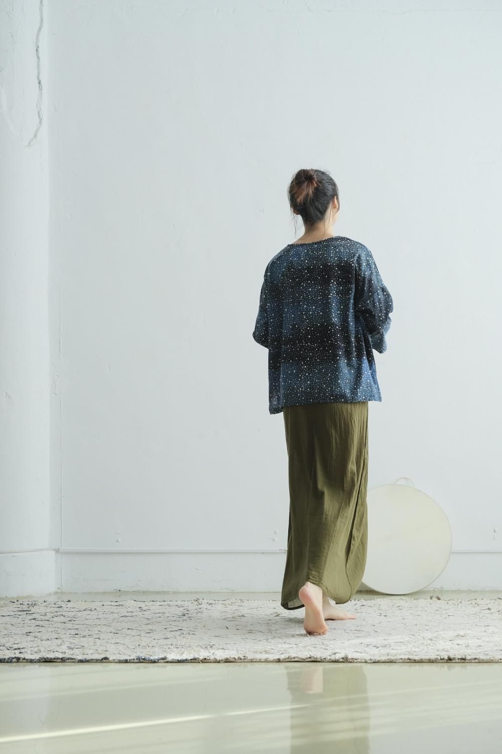 風のような軽さを感じる、モスリンカディ生地を使ったゆったりとしたトップス。手染めの独特なカラーで色移りに注意。