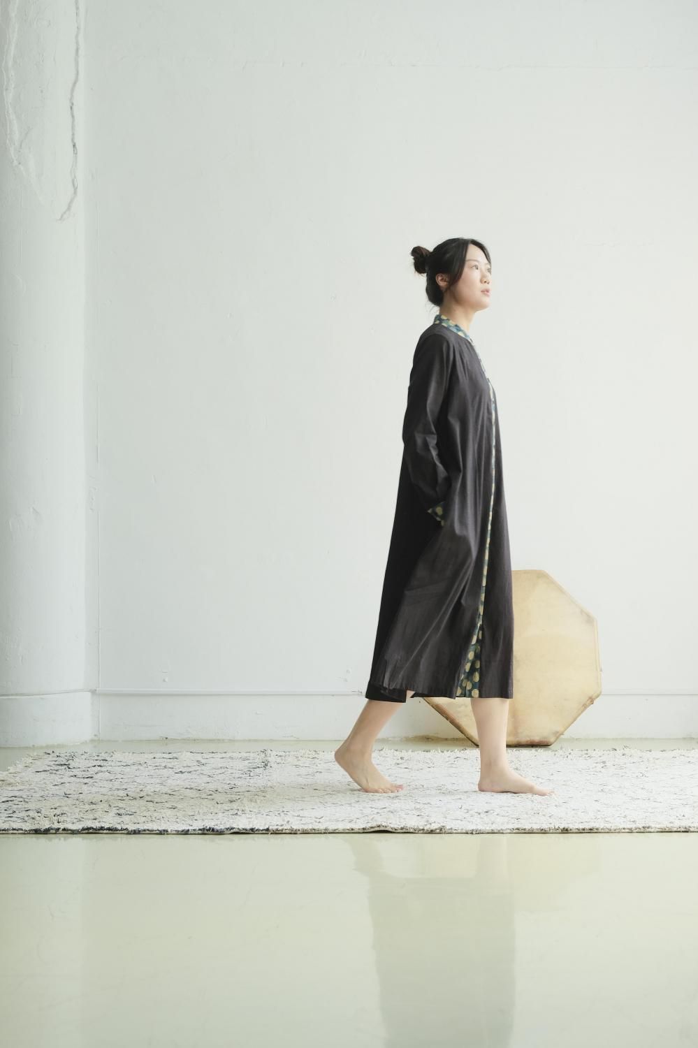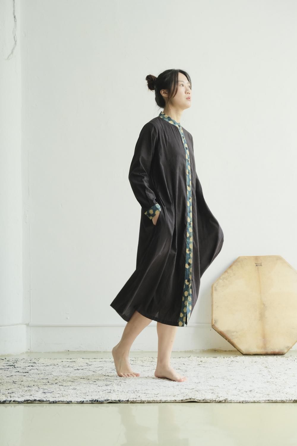 シャツワンピース bloom。上半身すっきり、下半身広がり、着まわし力抜群。暖かい日はワンピース、寒い日はレイヤードスタイルで。手染め製品、個々に違いあり。
