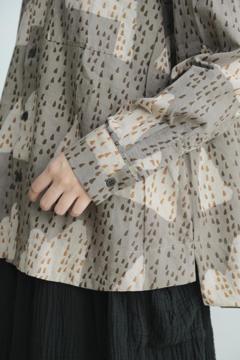 シンプルで上品なプリントシャツ。ユニセックスで快適な着心地。コットン100%素材。肩幅38cm、襟幅14cm。手染め、手織りの職人技。一点一点異なる色合い。シーズンレスな実用性。